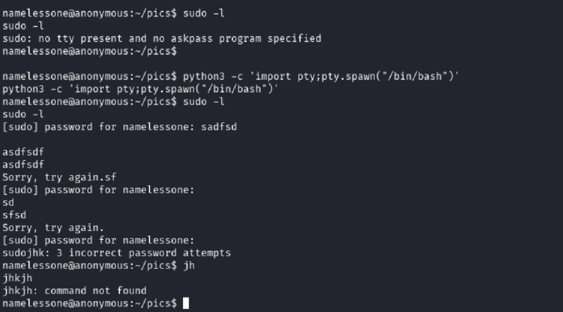 After that, I attempted to execute a sudo -l command again, but it prompted for a password — which I didn’t have. I moved on.